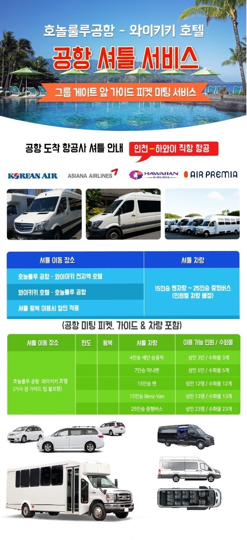 호눌룰루 국제공항 에서 와이키키 지역에 호텔 목적지까지 신속하고 안전하게 운행하고 있습니다, 공항 도착에서 부터 가이드 안내를 받으며 수화물 절차 및 짐 운반을 도와 드립니다, 빠르고 편안하게 호텔 까지 모셔다 드립니다, 또한 여행 일정을 마치고 돌아가는 공항 셔틀에서도 호텔 픽업 까지 편리한 서비스가 제공이 됩니다.